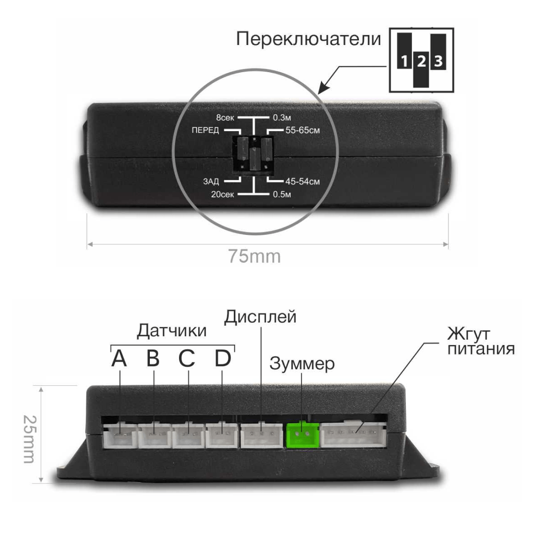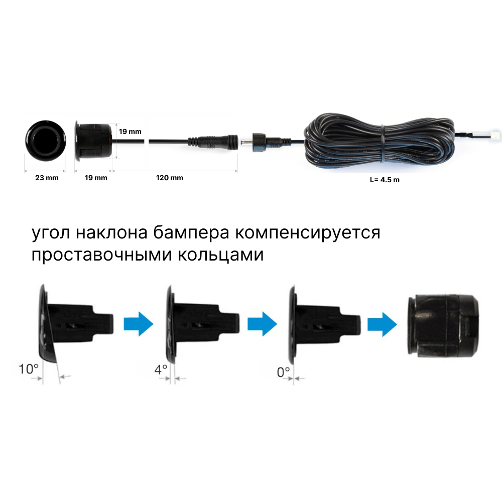 Комплектуется 4 датчиками типа A (установка с внешней стороны бампера)