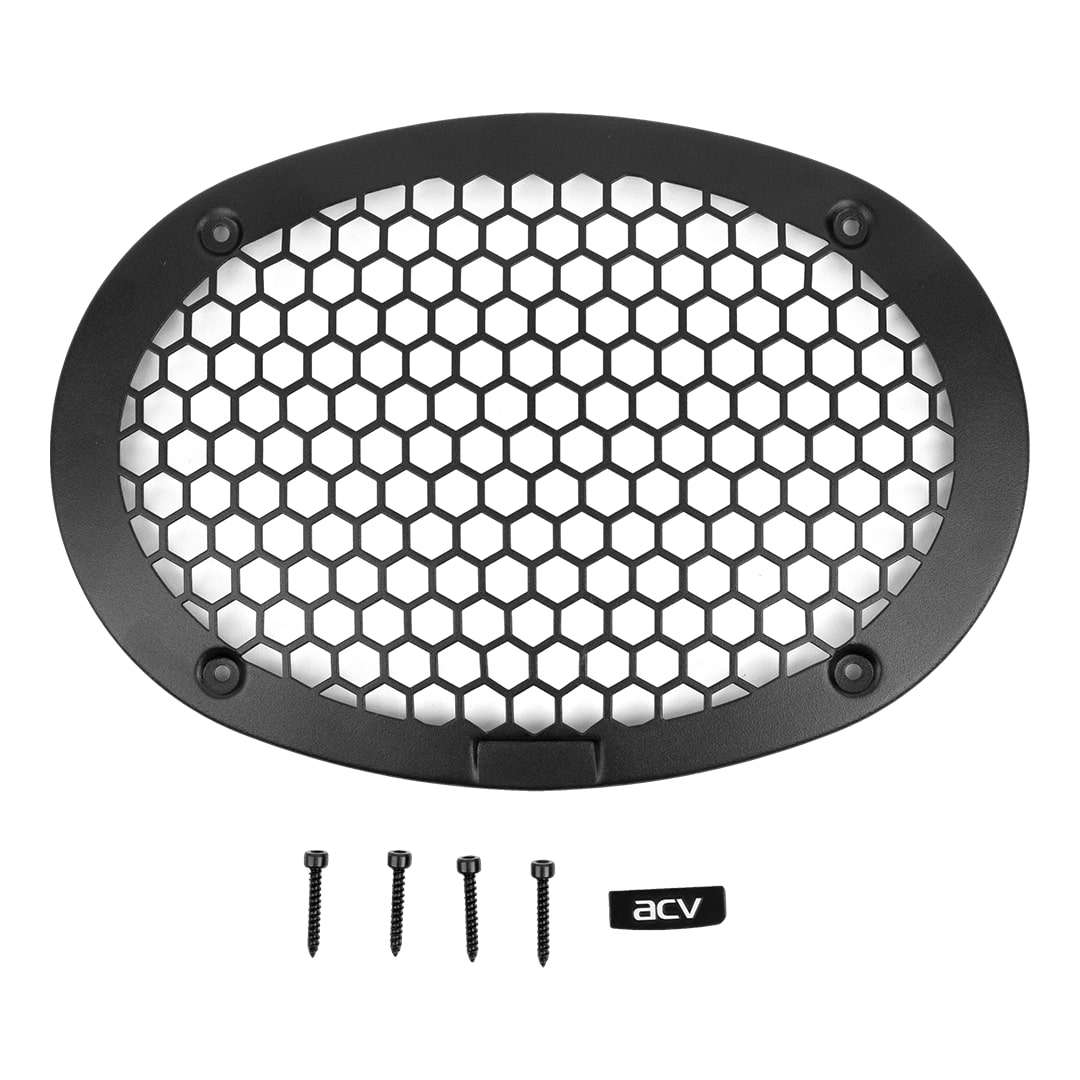 Гриль стальной для акустики 6х9" (15x22,5 см), крупная ячейка (соты), саморезы и фирменный шильд ACV в комплекте, цвет черный. -