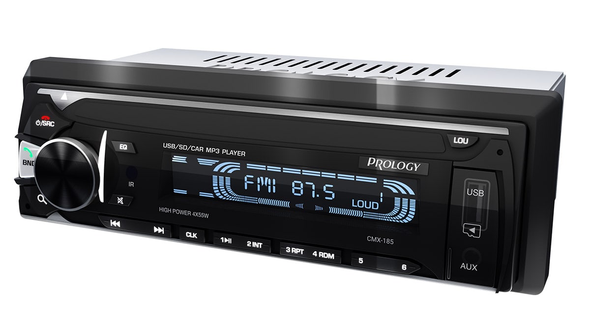 PROLOGY CMX-185 — FM SD/USB ресивер с Bluetooth, это автомагнитола стандартного размера 1DIN, которая обеспечивает прием радиостанций в диапазоне FM, воспроизведение медиафайлов, записанных на карты памяти USB / microSD, передачу звука с внешних источников, а также управление мобильным телефоном через интерфейс Bluetooth (ver. 4,2). Кроме того, устройством можно управлять с помощью приложения, установленного на Ваш смартфон с операционной системой Android.*