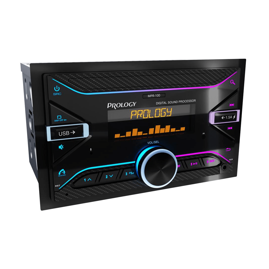 PROLOGY MPR-100 — FM / USB ресивер с Bluetooth и встроенным DSP - аудиопроцессором, стандартного размера 2DIN, который обеспечивает прием радиостанций в диапазоне FM / УКВ / AM и воспроизведение медиафайлов MP3, WAV, и FLAC форматов, записанных на USB накопители, передачу звука с внешних источников через линейный аудиовход и беспроводной интерфейс Bluetooth. Поддерживается управление мобильным телефоном через интерфейс Bluetooth (ver. 4,2).