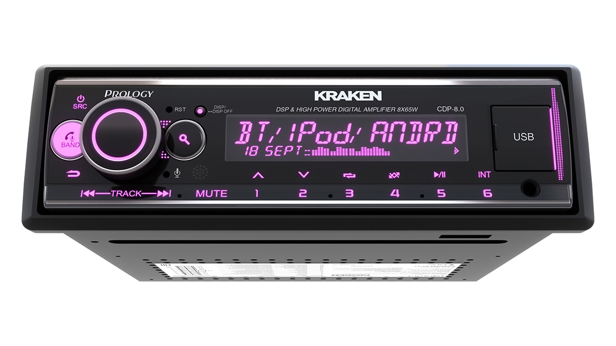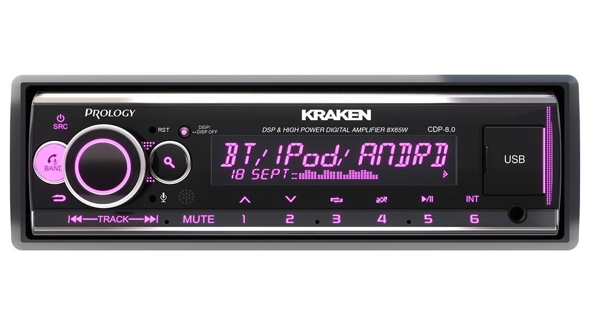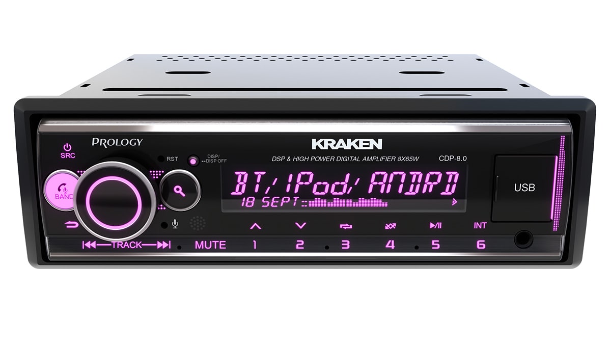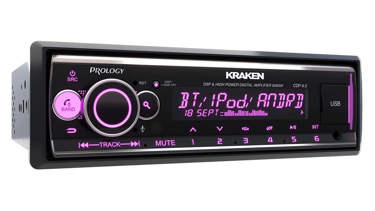 PROLOGY CDP-8.0 KRAKEN — FM / USB ресивер с Bluetooth и встроенным DSP - аудиопроцессором, стандартного размера 1DIN, который обеспечивает прием радиостанций в диапазоне FM / УКВ и воспроизведение медиафайлов MP3, WAV и FLAC форматов, записанных на USB накопители, передачу звука с внешних источников через линейный аудиовход и беспроводной интерфейс Bluetooth. Поддерживается управление мобильным телефоном через интерфейс Bluetooth (ver. 4,2)
