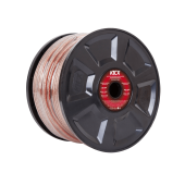 10GA акустический медно-алюминиевый (38%/62%) двухжильный кабель, прозрачная изоляция, маркировка полюсов, маркировка длины 0,5м, диаметр жилы 2,59 мм, площадь 5,27 кв.мм, внешний диаметр 5,5мм*2 , бухта 50м.