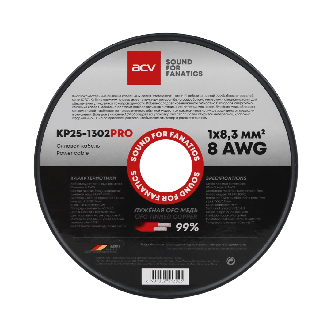 ACV KP25-1302PRO Силовой кабель красный 8AWG (25m) чистая безкислородная медь