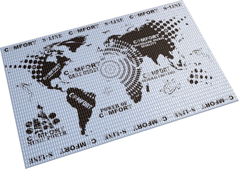 Comfort mat S2 — вибропоглощающий материал с разработанным дизайном карты мира EarthPrint помогает как в работе с материалом при раскрое, так и гораздо легче облегчает проведения монтажных работ, а уникальная рецептура S-Formula придаёт вибропоглотителям не только премиальный вид, но и отличные решения.