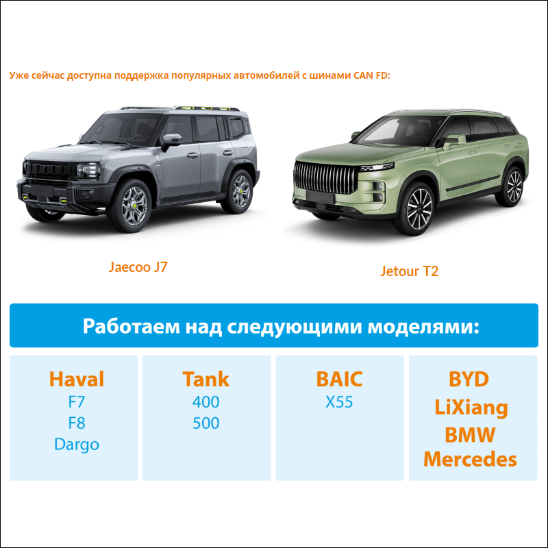 Обеспечивает бережную установку и минимальное вмешательство в электронику автомобиля. Постоянно обновляемая библиотека 2CAN+2LIN+FD протоколов содержит самый полный список автомобилей, продающихся на территории России и стран Содружества